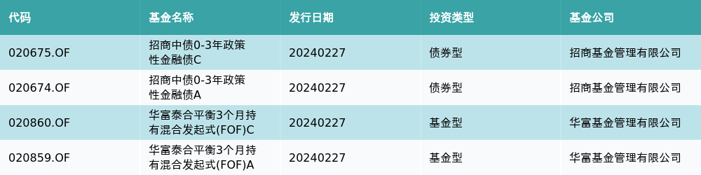 2月27日有4只新基金发行,分别为:招商中债0-3年政策性金融债C、招商中债0-3年政策性金融债A、华富泰合平衡3个月持有混合发起式(FOF)C、华富泰合平衡3个月持有混合发起式(FOF)A,详情见下表: