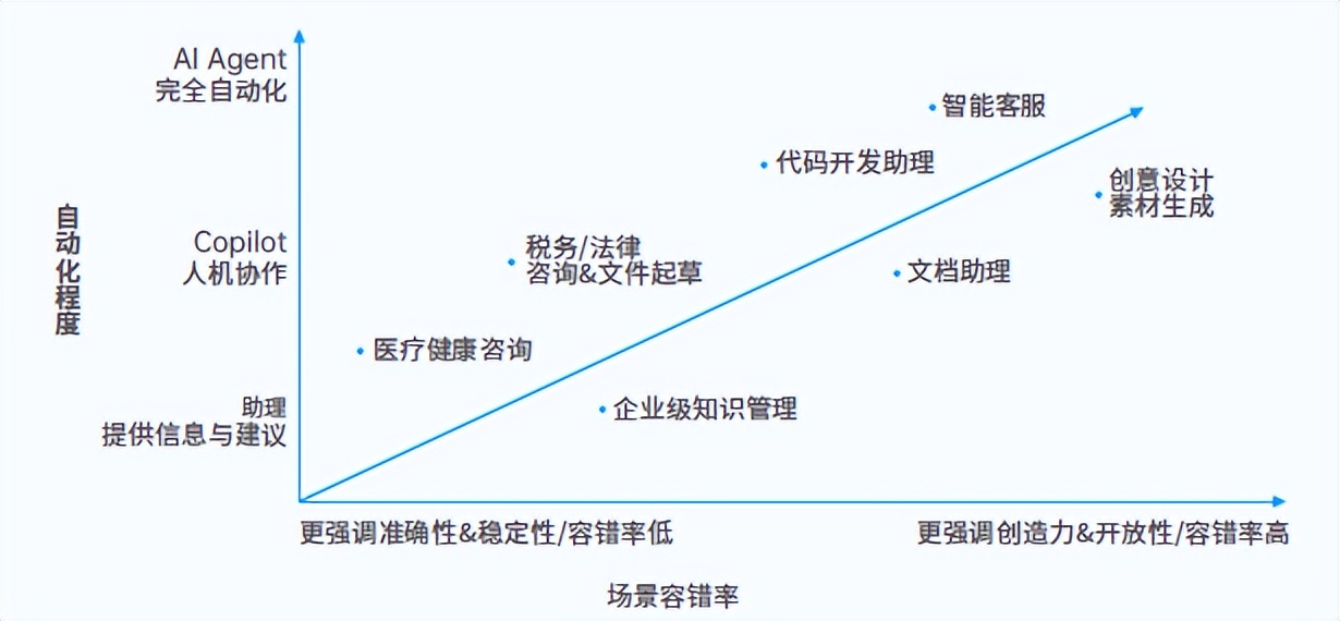 生产力领域中,在素材生成、创意设计、文案草稿撰写、代码开发助理等容错率较高的场景,AI应用或许能够更早落地。
