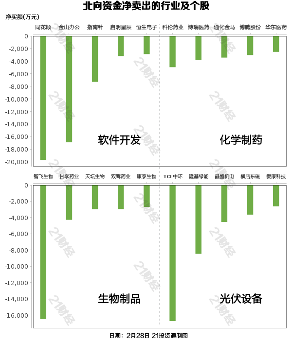 北向资金减持了66个行业,其中软件开发最多,净卖出金额达5.30亿元,其次是化学制药行业,净卖出3.75亿元。