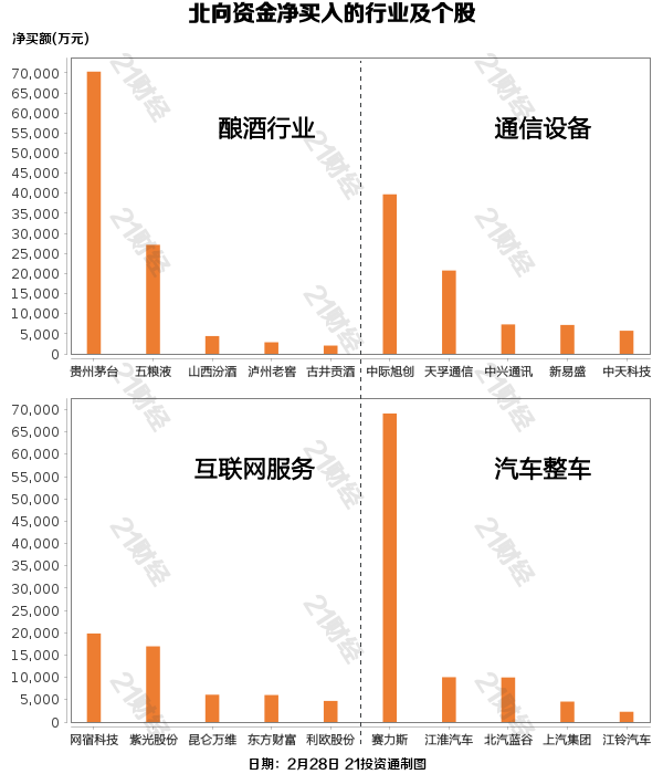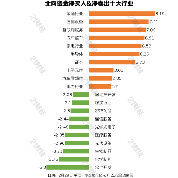 从净买入金额来看,北向资金增持了34个行业,其中酿酒行业居首,净买入金额达8.19亿元,其次是通信设备行业,净买入7.41亿元。