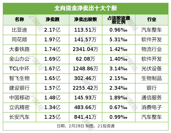 北向资金净卖出比亚迪(002594.SZ)、同花顺(300033.SZ)、大秦铁路(601006.SH)、金山办公(688111.SH)、TCL中环(002129.SZ)居前,其中,比亚迪被净卖出2.17亿元,同花顺被净卖出1.97亿元,大秦铁路被净卖出1.74亿元,金山办公被净卖出1.69亿元,TCL中环被净卖出1.67亿元。