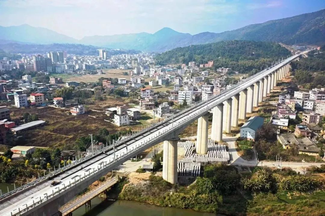 梅龙高铁是广东省东部重要交通基础设施,线路自梅汕高铁梅州西站引出,沿途经过梅州市梅县区、兴宁市、五华县和河源市龙川县,终至赣深高铁龙川西站,大致呈东西走向,运营里程95.6公里,为双线高速铁路,桥隧比82.72%,设计速度350公里/小时。全线站前工程于2020年7月开工。目前,桥梁、隧道、路基工程已全部完成,轨道工程、四电工程、站房工程正快马加鞭推进。