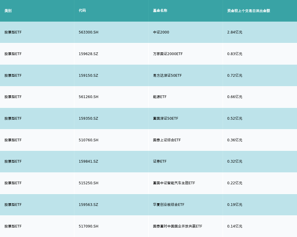 昨日股票型ETF资金流出最多的3支ETF及其流入金额分别为:中证2000(流出2.84亿元)、万家国证2000ETF(流出0.83亿元)、易方达深证50ETF(流出0.72亿元)。资金流出前10详情见下表: