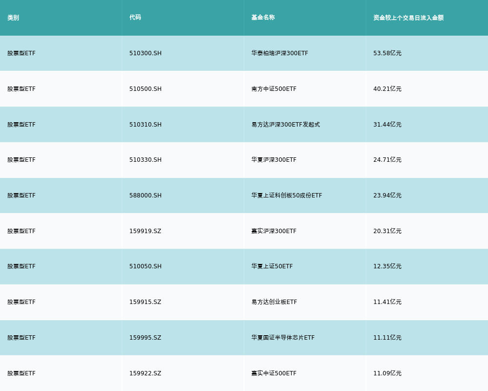 昨日股票型ETF资金流入最多的3支ETF及其流入金额分别为:华泰柏瑞沪深300ETF(流入53.58亿元)、南方中证500ETF(流入40.21亿元)、易方达沪深300ETF发起式(流入31.44亿元)。资金流入前10详情见下表: