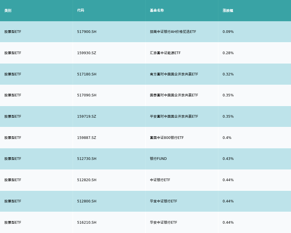 昨日股票型ETF跌幅最大的3支ETF及其收益率分别为:招商中证银行AH价格优选ETF(0.09%)、汇添富中证能源ETF(0.28%)、南方富时中国国企开放共赢ETF(0.32%)。跌幅前10详情见下表: