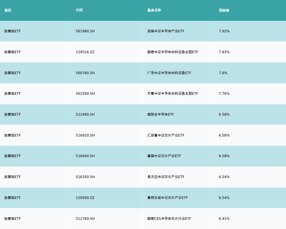 昨日股票型ETF涨幅最高的3支ETF及其收益率分别为:招商中证半导体产业ETF(7.92%)、国泰中证半导体材料设备主题ETF(7.83%)、广发中证半导体材料设备ETF(7.8%)。涨幅前10详情见下表: