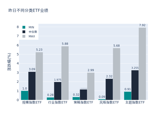 昨日股票型ETF收益率中位数为2.65%。其中按照不同分类,规模指数中鹏华上证科创板50成份增强策略ETF收益率最高,为5.23%;行业指数中国泰中证全指集成电路ETF收益率最高,为5.88%;策略指数中前海开源中证500等权ETF收益率最高,为2.99%;风格指数中广发上证科创板成长ETF收益率最高,为5.68%;主题指数中招商中证半导体产业ETF收益率最高,为7.92%。