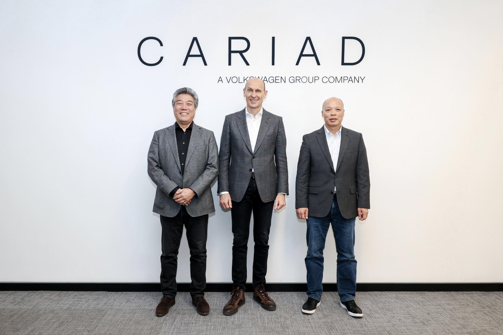 从左至右分别为:CARIAD中国CEO常青、大众汽车集团(中国)董事长兼首席执行官贝瑞德、CARIAD中国履新CEO韩三楚。图源:大众中国