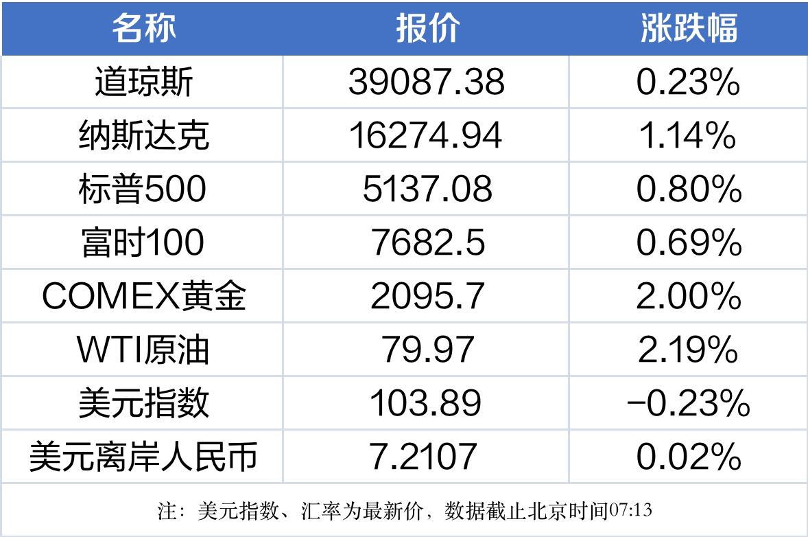 1、美股三大股指集体收涨,道指涨0.23%报39087.38点,标普500指数涨0.8%报5137.08点,纳指涨1.14%报16274.94点。纳指和标普500指数创历史新高。芯片股大涨,AMD涨超5%,英伟达涨4%,纷纷创收盘历史新高。英伟达市值首次超过2万亿美元。本周,道指跌0.11%,标普500指数涨0.95%,纳指涨1.74%。