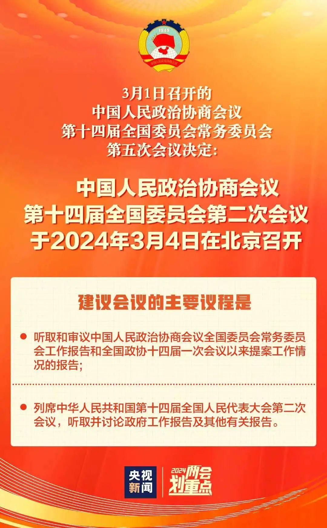 1、中国人民政治协商会议第十四届全国委员会第二次会议于3月4日在北京召开。