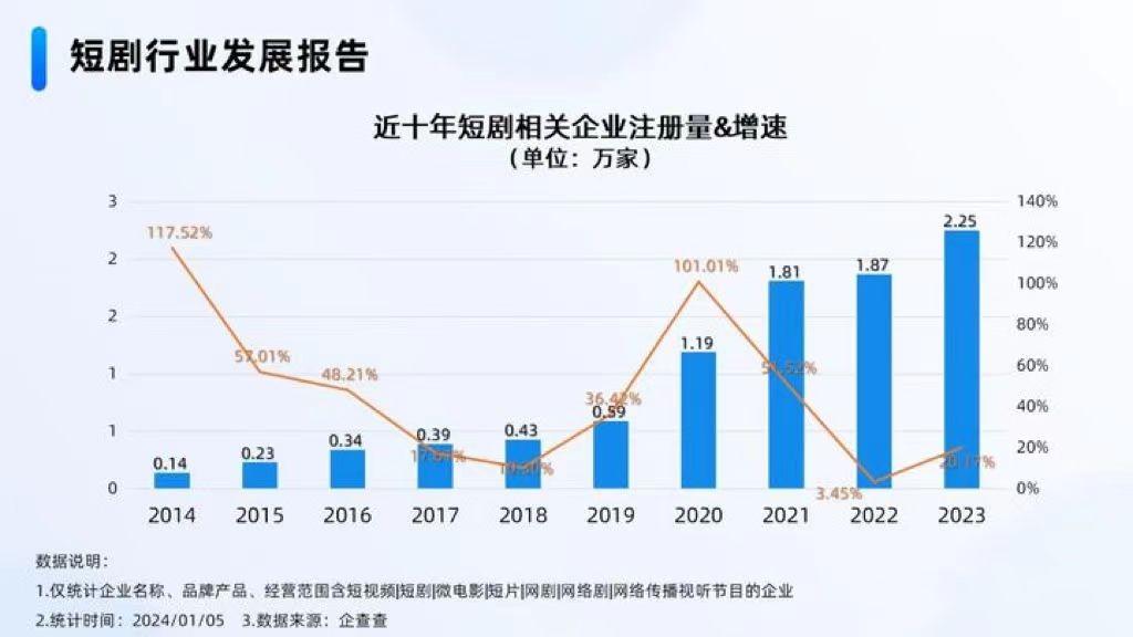 根据企查查数据显示,截止1月5日,全国现存7.81万家短剧相关企业,2023年短剧相关企业新增2.25万家,同比增长20.17%。