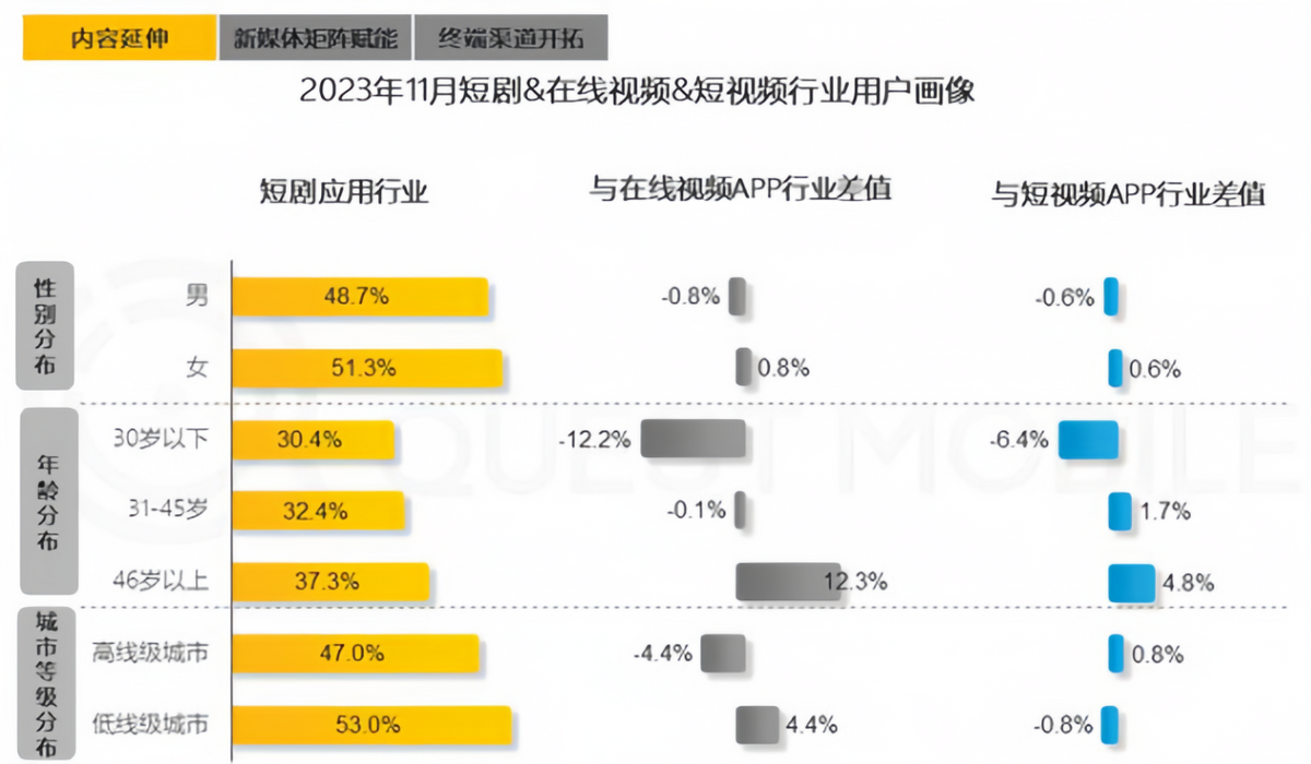 根据QuestMobile去年11月的数据显示,短剧对银发人群的渗透优于在线视频及短视频,在短剧应用中,46岁以上人群占比为37.3%,分别高出长视频App、短视频App 12.3%、4.8%。