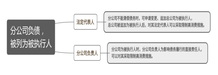 2、分公司为被执行人时,根据《最高人民法院关于限制被执行人高消费及有关消费的若干规定》第三条第二款的规定,分公司负责人为该单位的主要负责人、影响债务履行的直接责任人、实际控制人等,也可以对其采取限制消费的措施。