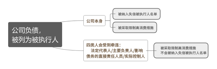 公司的法定代表人是按照相关法律或者公司章程的规定,代表公司从事民事活动的责任人。当公司作为被执行人的案件进入执行程序后,执行法院通常会依申请将被执行人公司纳入失信被执行人名单并且限制其高消费,而公司法定代表人及相关四类人也可能会受到牵连,被一并采取限制高消费措施。需要注意的是,这几类自然人会被牵连限高,但不会被纳入失信被执行人名单。