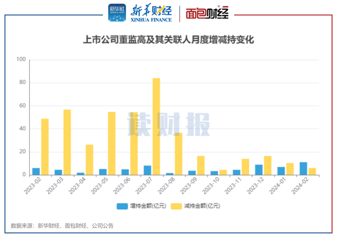 新华财经和面包财经研究员根据上市公司的信披数据统计,2024年2月,沪深两市上市公司董监高及其关联人减持金额合计约5.92亿元,涉及30家公司;增持金额合计约11.02亿元,涉及301家公司;增、减持金额相抵之后,净增持金额约5.1亿元。