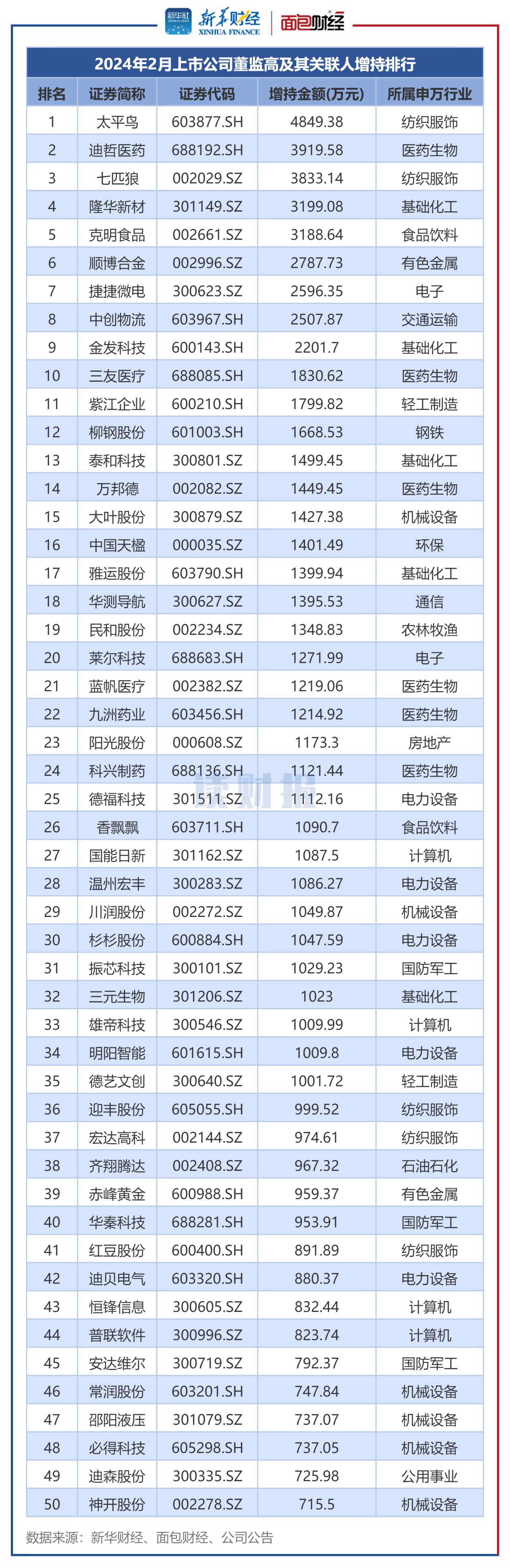 其中,2月增持金额最多的是太平鸟,该公司的5位董监高在2月共增持15次,增持金额约为0.48亿元。