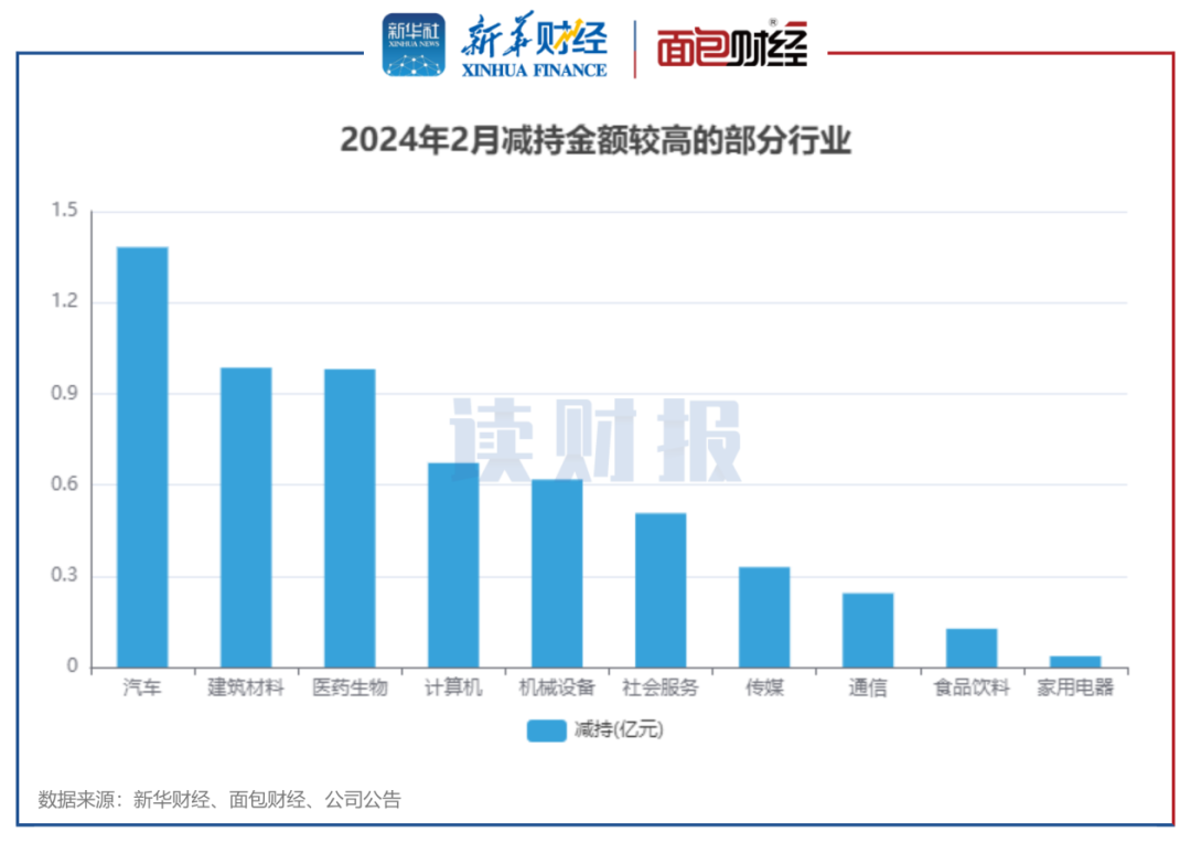 在申万行业分类下,2月份,汽车行业的减持金额居首,约1.38亿元;建筑材料行业的减持金额位居第二,约0.99亿元;医药生物行业的减持金额也居前,约0.98亿元。