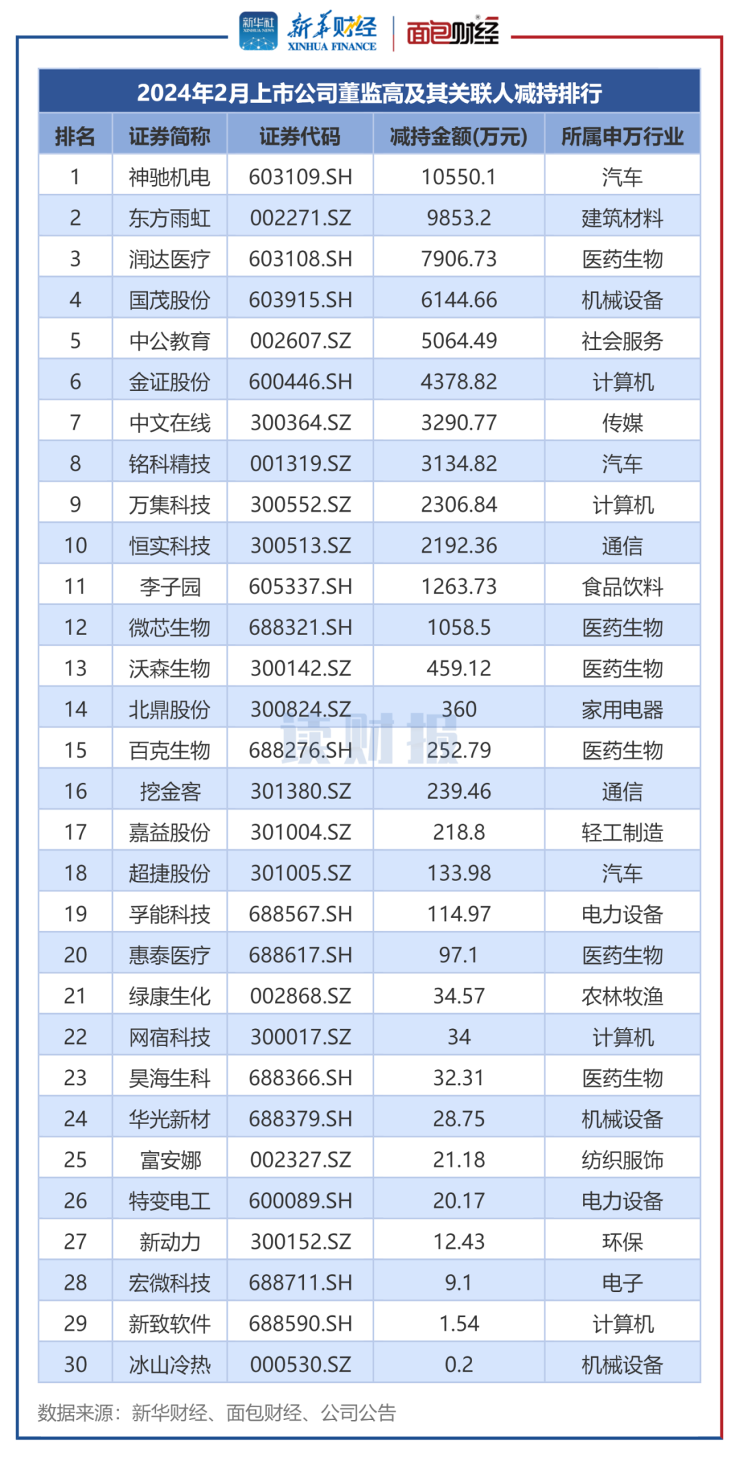 具体来看,2月份减持金额最多的个股为神驰机电。该公司董事艾纯通过二级市场买卖的方式合计减持690万股,减持金额约1.06亿元。