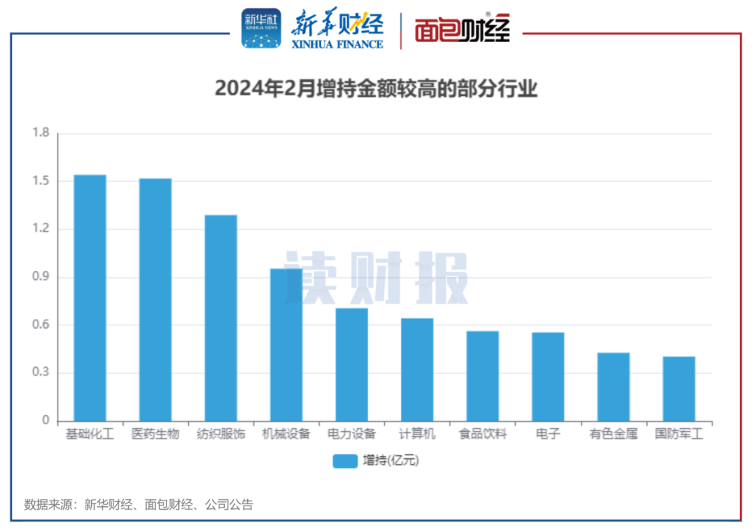从行业来看,2月份基础化工行业的增持金额居首,约1.54亿元;医药生物行业的增持金额排在第二,约1.52亿元;纺织服饰行业的增持金额也在前列,约1.29亿元。