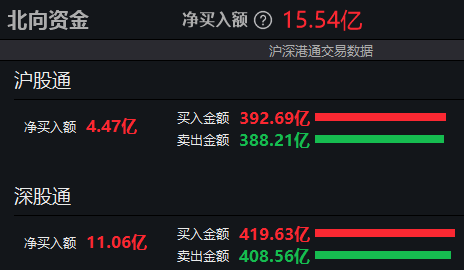 北向资金今日净买入15.54亿元。其中沪股通净买入4.47亿元,深股通净买入11.06亿元。