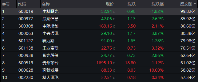 沪深两市今日成交额10670亿,较上个交易日缩量101亿。个股方面,中科曙光成交额达99.82亿元居首,浪潮信息、中际旭创、中兴通讯成交额均超80亿元。
