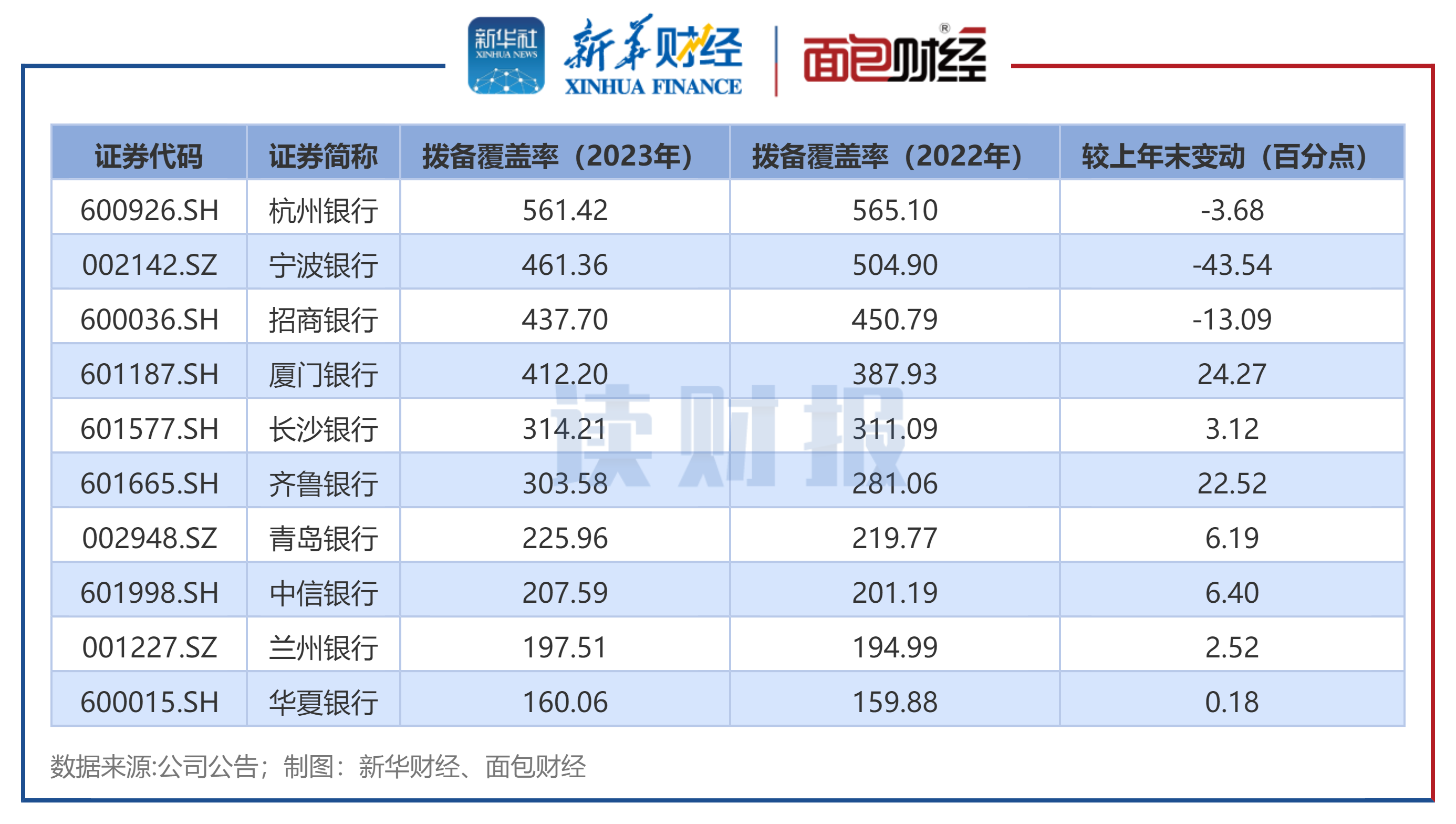 从目前已披露数据来看,上市银行的拨备覆盖率大多处于高位,10家银行中有6家银行拨备覆盖率超过300%。其中,杭州银行、宁波银行、招商银行和厦门银行的拨备覆盖率均超400%,分别为561.42%、461.36%、437.7%、412.2%。
