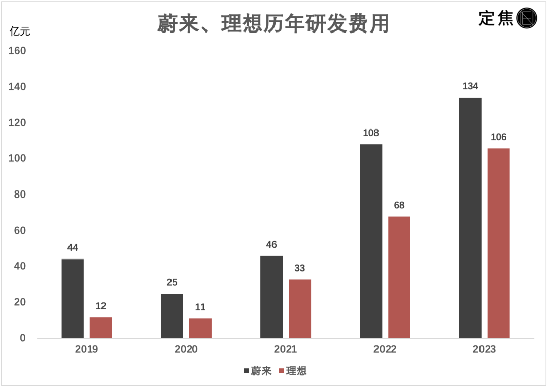 财报数据显示,蔚来研发开支逐年递增,2022年以前每年最高达到40多亿元,2022年直接跳涨至108亿元,2023年更是高达134亿元。作为对比,理想在2023年大力推进研发,支出达到创纪录的106亿元,但还是跟蔚来有差距。需要注意的是,蔚来的收入不到理想的一半。