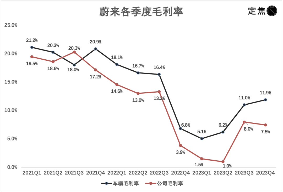 现在来看,去年二季度是最低谷。蔚来汽车销售毛利率在三季度重回两位数,四季度进一步回升至11.9%,这是一个好迹象。