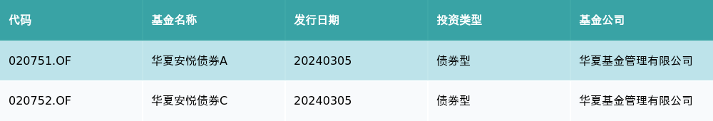3月5日有2只新基金发行,分别为:华夏安悦债券A、华夏安悦债券C,详情见下表: