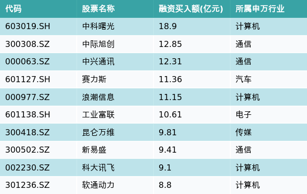 3月5日,两市共有3335只个股有融资资金买入,其中中科曙光、中际旭创、中兴通讯排名前三,买入金额分别18.9亿元、12.85亿元、12.31亿元。融资买入额前10个股详情见下表:
