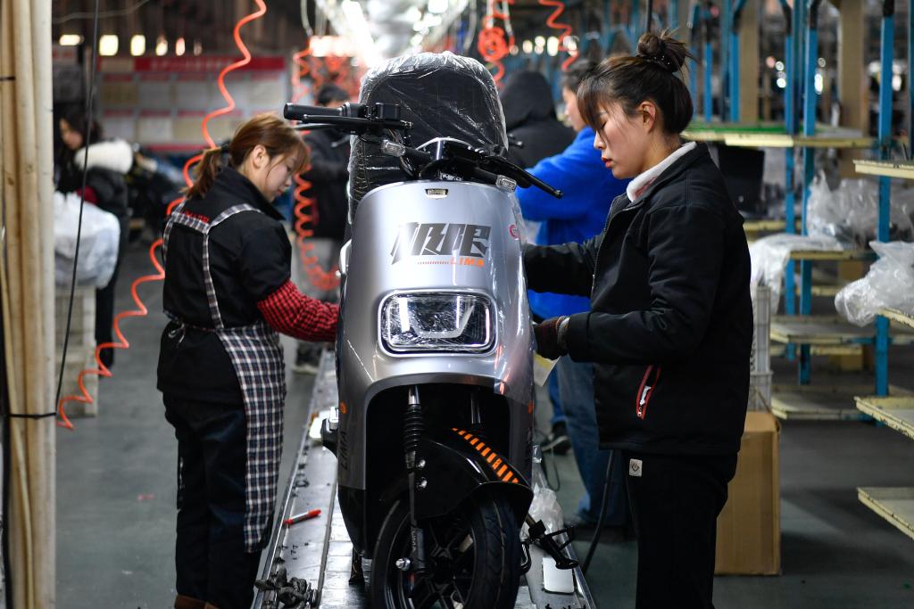 1月24日,工人在河南省汝南县立马新能源电动车产业园生产线上组装车辆。新华社记者吴刚摄