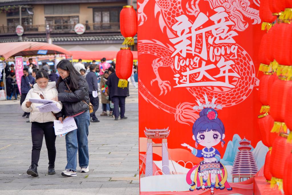 2月19日,求职者在贵州省黔东南苗族侗族自治州丹寨县万达小镇“春风行动”暨东西部劳务协作招聘会上了解岗位信息。新华社发(杨胜贤摄)