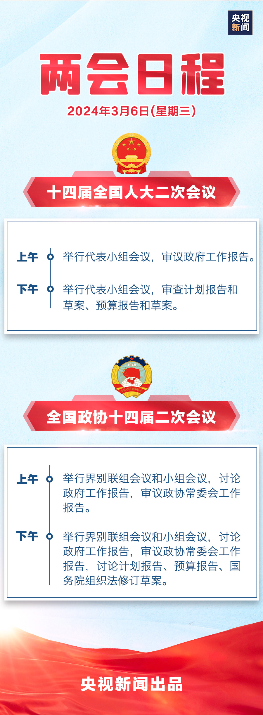 十四届全国人大二次会议各代表团6日全天举行代表小组会议。上午审议政府工作报告,下午审查计划报告和草案、预算报告和草案。