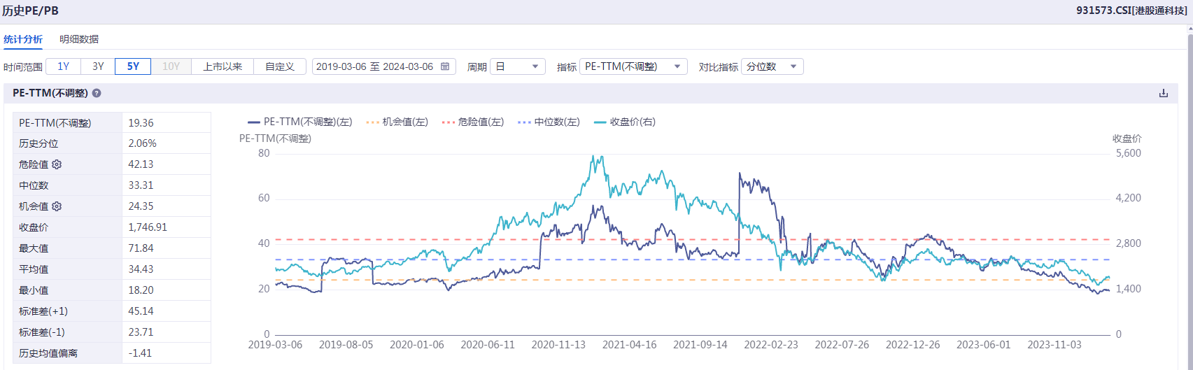 目前,中证港股通科技指数(931573.CSI)估值较低,截至目前,该指数PE-TTM19.36%,处于5年期2.06%历史分位点,估值处于5年来较低水平。