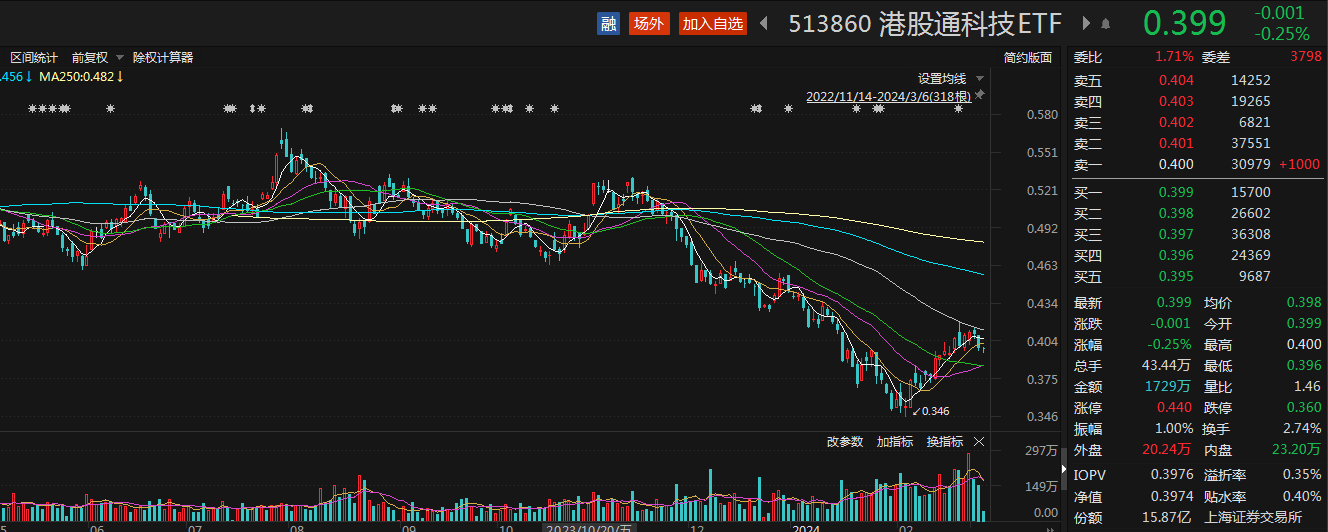 多只港股ETF盘中震荡回升,其中港股通科技ETF(513860)盘中震荡跌幅收窄,现跌0.25%,盘中成交额突破1700万元,换手率2.74%,盘中持续溢价,溢折率0.35%。