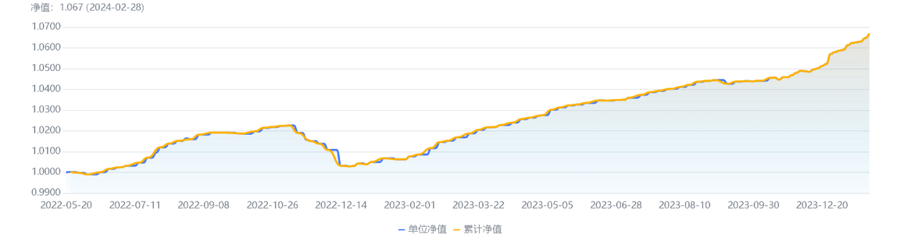 从累计净值表现看,受2022年末银行理财破净潮影响,该产品中期累计净值有一定回落,随后2023年以来累计净值稳步上升,截至2024年2月28日,产品最新累计净值为1.067,成立以来累计净值增长率为4.40%,折合成年化收益率为5.08%,超过业绩比较基准上限143个基点。