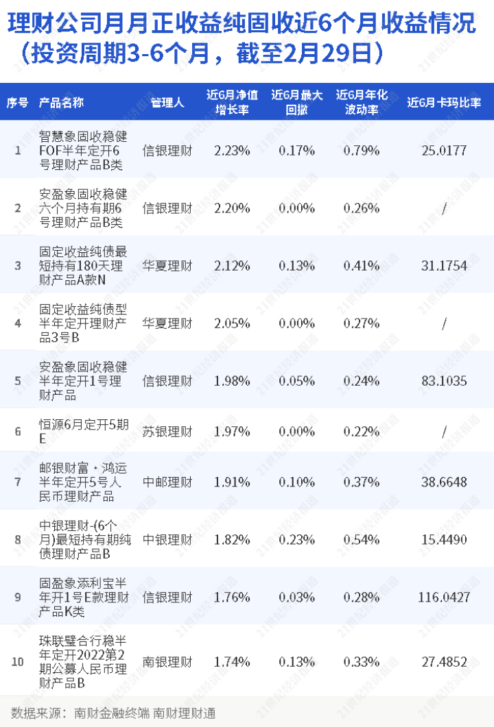 信银理财“智慧象固收稳健FOF半年定开6号理财产品B类”和“安盈象固收稳健六个月持有期6号理财产品B类”分别以近6个月净值增长率2.23%和2.20%位列前二,华夏理财“固定收益纯债最短持有180天理财产品A款N”则以近6个月净值增长率2.12%位列榜单第三。