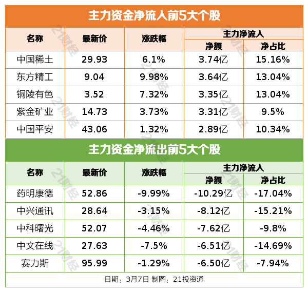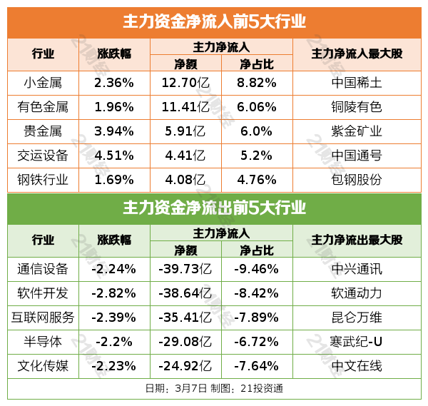 3月7日,市场全天震荡走低,三大指数均收跌。截至收盘,沪指跌0.41%,深成指跌1.37%,创业板指跌2.33%。盘面上,有色金属等周期股早盘走强。设备更新概念股表现活跃,高铁方向领涨。旅游股尾盘异动。下跌方面,CRO概念股集体下挫,AI概念股展开调整。总体上个股跌多涨少,全市场超3500只个股下跌。沪深两市成交额9817亿,较上个交易日放量500亿。