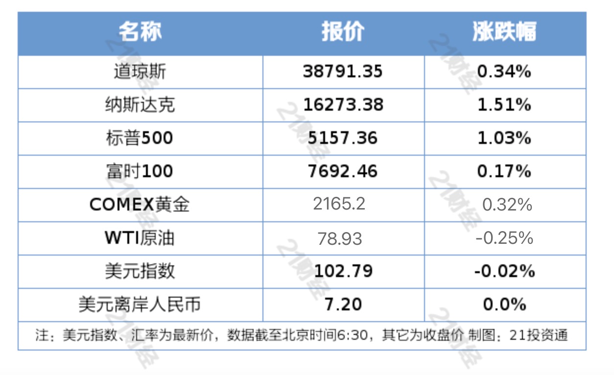 纽约股市三大股指7日上涨。截至当天收盘,道琼斯工业平均指数比前一交易日上涨130.30点,收于38791.35点,涨幅为0.34%;标准普尔500种股票指数上涨52.60点,收于5157.36点,涨幅为1.03%;纳斯达克综合指数上涨241.83点,收于16273.38点,涨幅为1.51%。