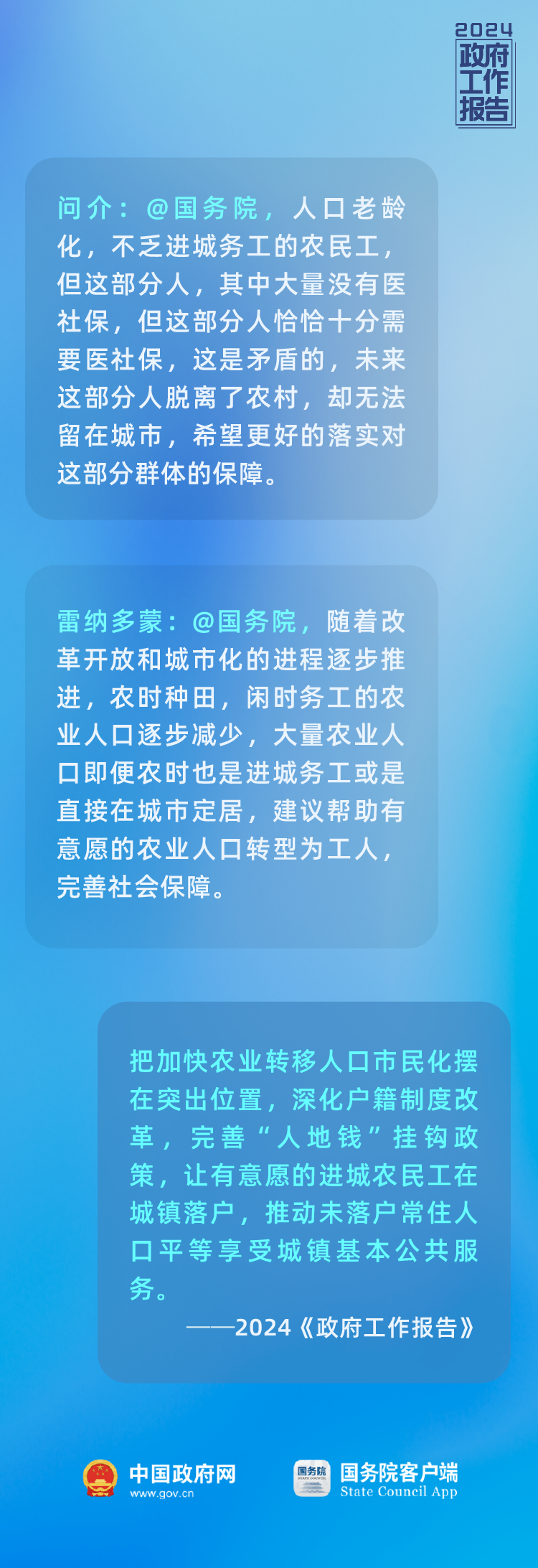 全国两会前,中国政府网联合29家网络媒体平台开展“@国务院 我为政府工作报告提建议”建言征集活动,很多网民写下了自己的心声。关于托育、养老、农村学校、农业转移人口、消费,来看今年《政府工作报告》——