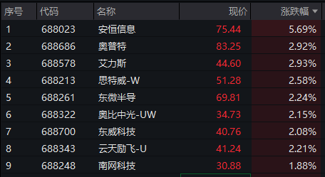 成分股涨跌各半,安恒信息涨超5%,奥普特、艾力斯涨近3%,思特威-W、东微半导、奥比中光-UW、东威科技、云天励飞-U均涨超2%。