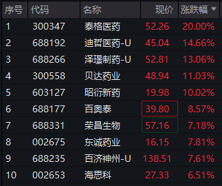3月14日,创新药板块大幅高开。相关指数中,中证创新药产业指数涨超3%,成分股中,泰格医药“20CM”涨停,迪哲医药-U、泽璟制药-U、贝达药业、昭衍新药均涨超10%,百奥泰、荣昌生物、东诚药业、百济神州-U均涨超7%。