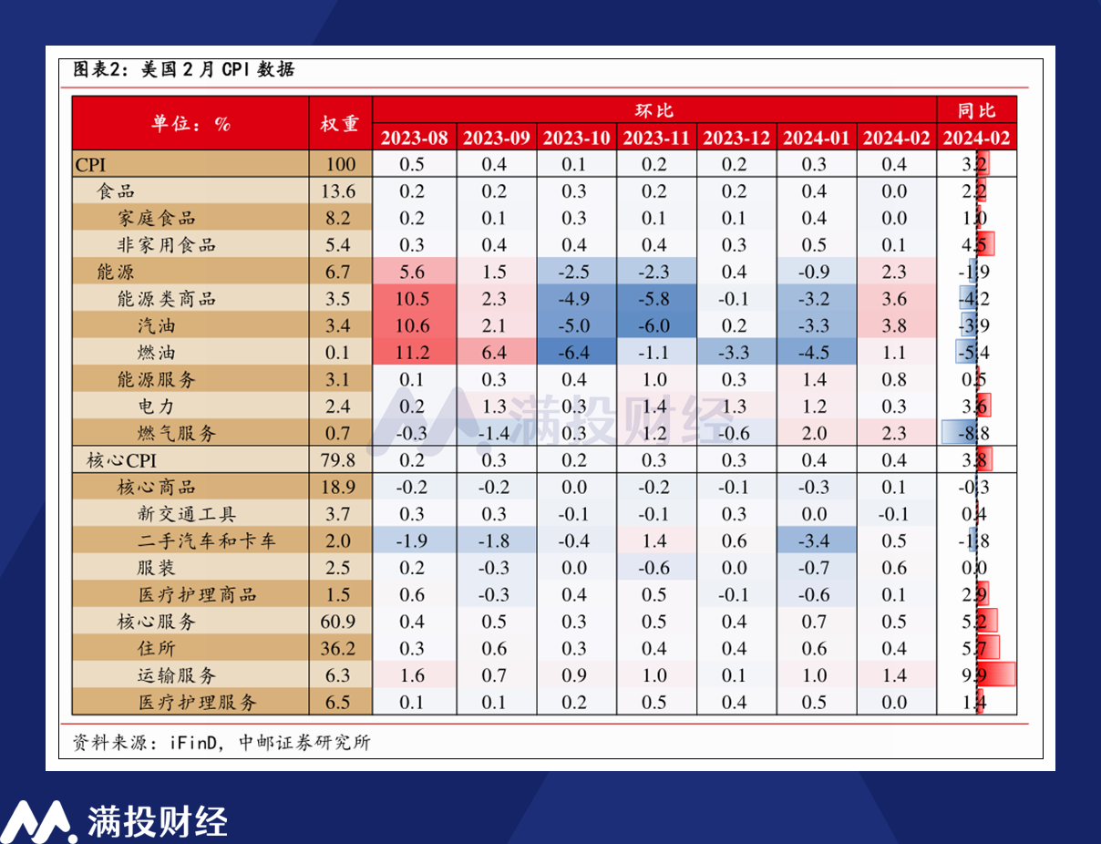 结合细分项来看,2月的美国CPI上行主要是受到能源价格推动影响,但市场所期待的核心CPI通胀进一步下行并未发生,而是显示出了较强的通胀粘性。维持通胀的主要项目来自住房租金、住宿、医疗保健和交通服务,而想让这些分项带着美国通胀走向3%下方,似乎还需要很多精力。