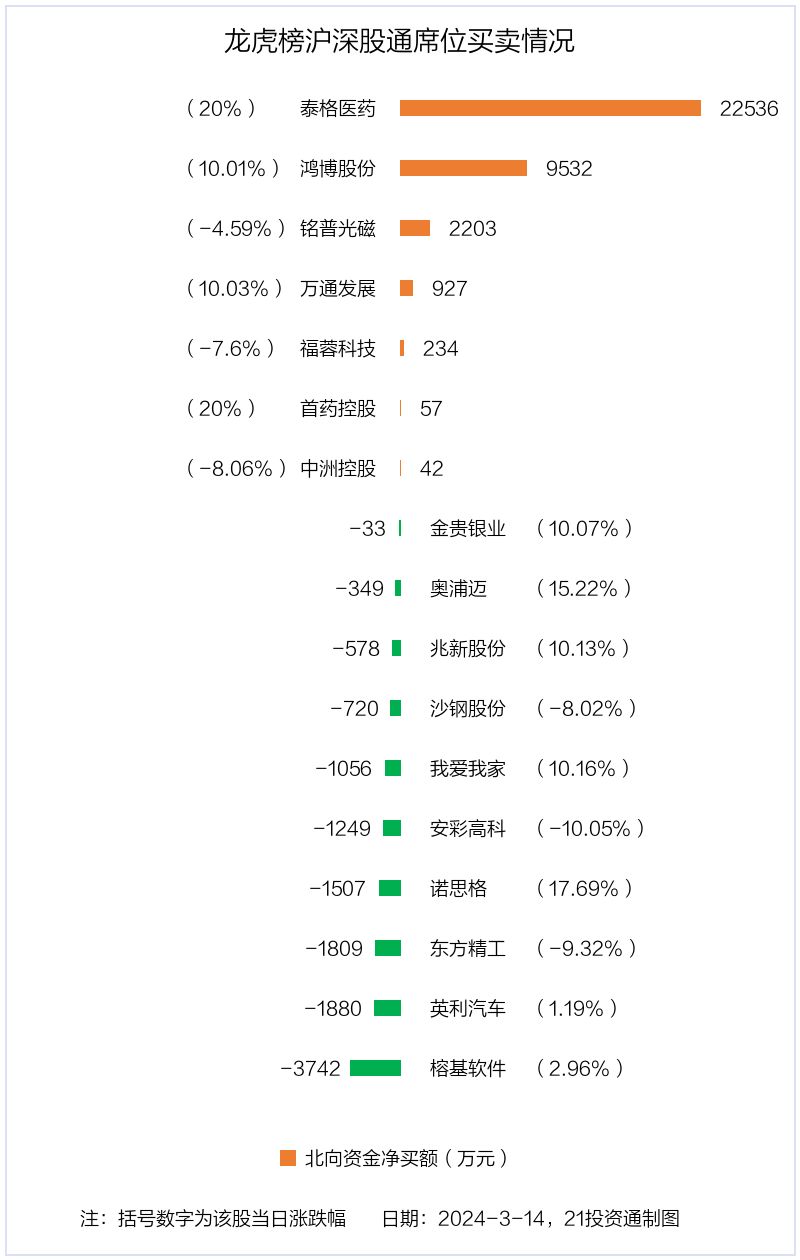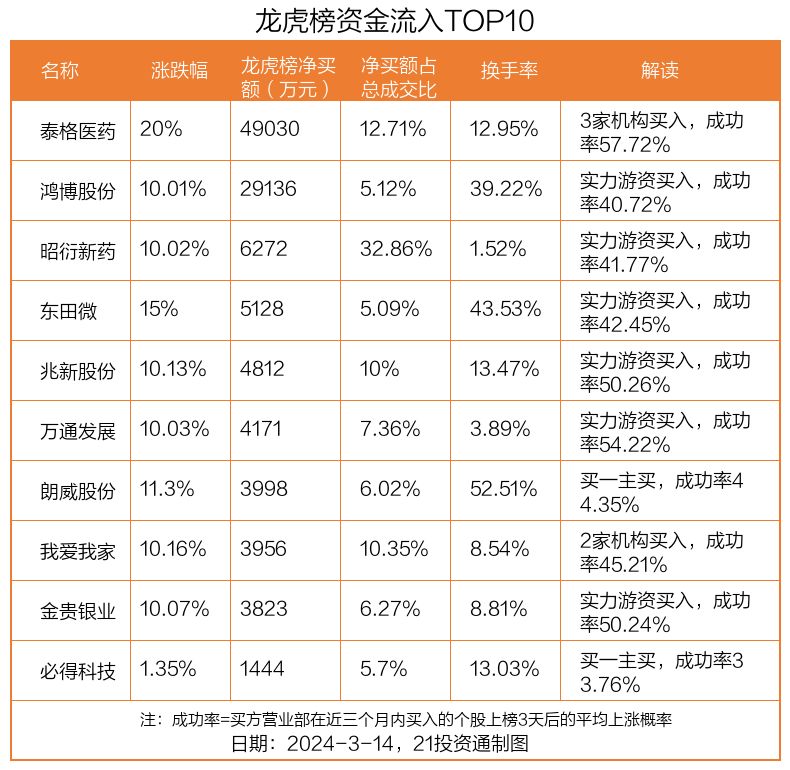 3月14日,上证指数下跌0.18%,深证成指下跌0.52%,创业板指下跌0.64%。盘后龙虎榜数据显示,共有45只个股因当日异动登上龙虎榜,资金净流入最多的是泰格医药(300347.SZ),达4.9亿元。