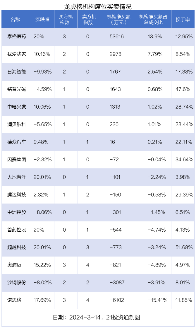 3月14日,16只个股龙虎榜出现了机构的身影,机构合计净买入4.96亿元。具体来看,机构净买入7股,净卖出9股。
