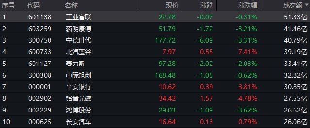 沪深两市半日成交额5209亿,较上个交易日同期缩量1056亿。个股方面,工业富联成交额51.33亿元居首,药明康德、宁德时代成交额均超40亿元,北汽蓝谷、赛力斯、中际旭创、平安银行成交额均超30亿元。
