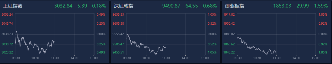 市场早盘震荡调整,创业板指领跌。南财金融终端显示,截至早盘收盘,沪指跌0.18%,深成指跌0.68%,创业板指跌1.59%。总体上个股涨多跌少,全市场超2800只个股上涨。