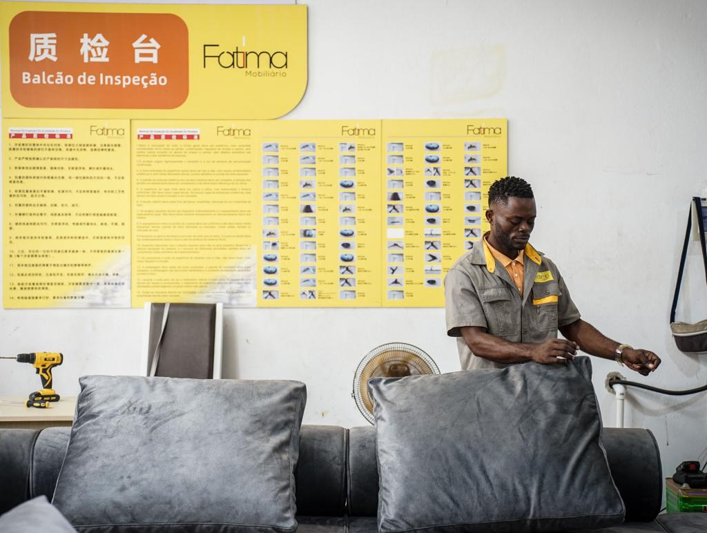 如今,法蒂玛家具厂的橱柜、衣柜等产品已占安哥拉国内市场四成,沙发品牌占比也达四分之一。总经理朱炳丰说,家具产业本地化加快,不仅提升了产品性价比,让更多老百姓用得起更好的产品,也带动当地供应商和加工企业成长起来。