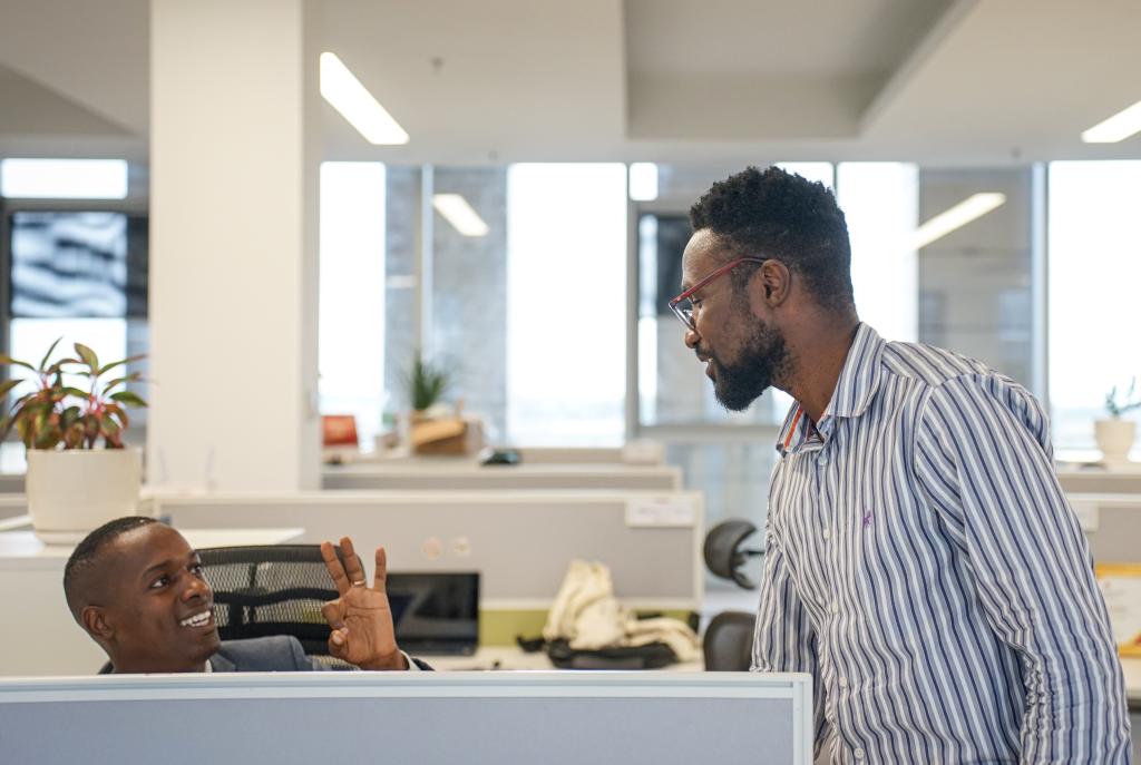 在安哥拉首都罗安达华为安哥拉科技园区,路易斯·埃里瓦尔多(右)和同事交谈。