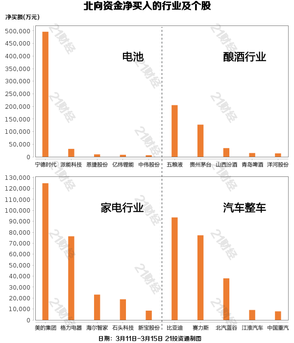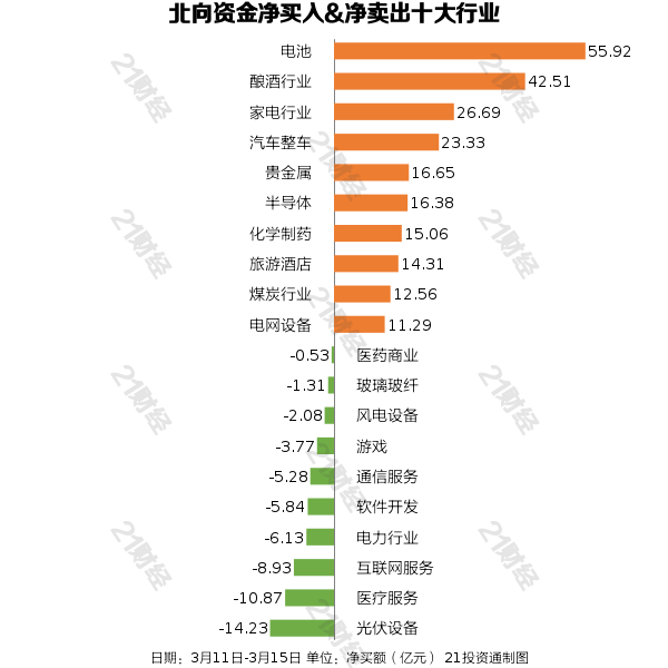 从净买入金额来看,北向资金增持了81个行业,其中电池居首,净买入金额达55.92亿元,其次是酿酒行业,净买入42.51亿元。